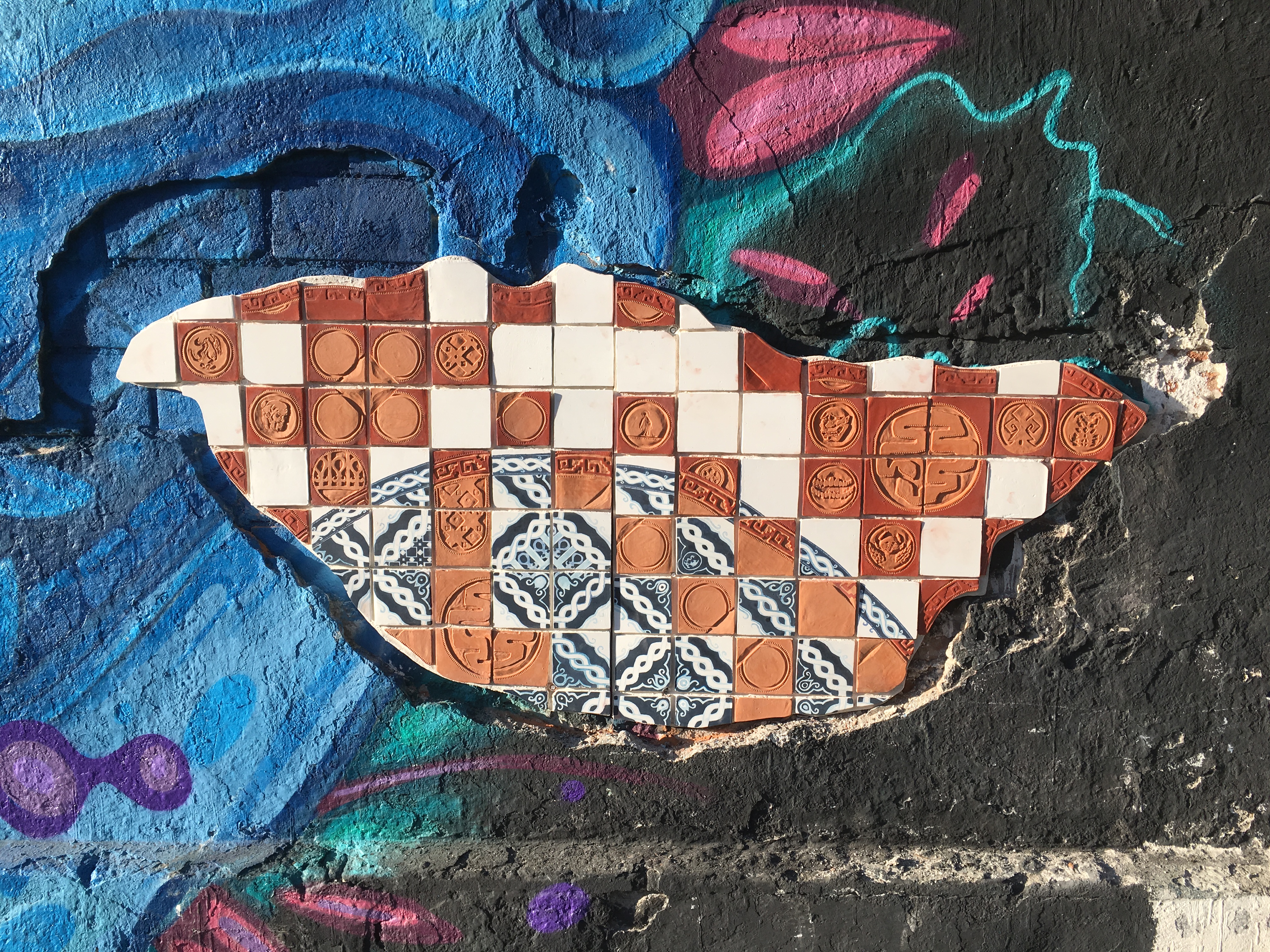 Created in Puebla, Mexico, this street installation combines the blue and white Talavera ceramics of the Spanish with the earthenware tiles of the pre-Hispanic world into a street installation that integrates both traditions, reflecting the complexities of the collision that defines the cultural landscape of Mexico today.Ceramic tile